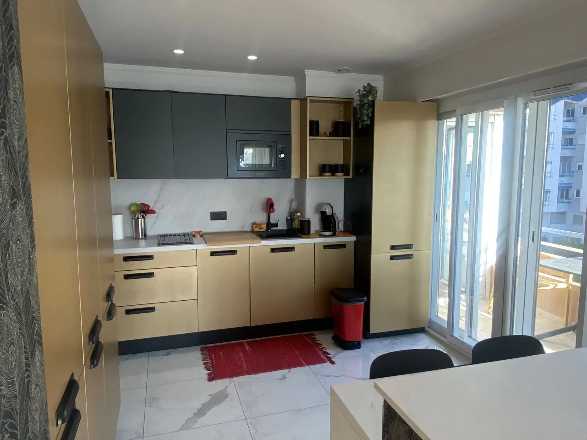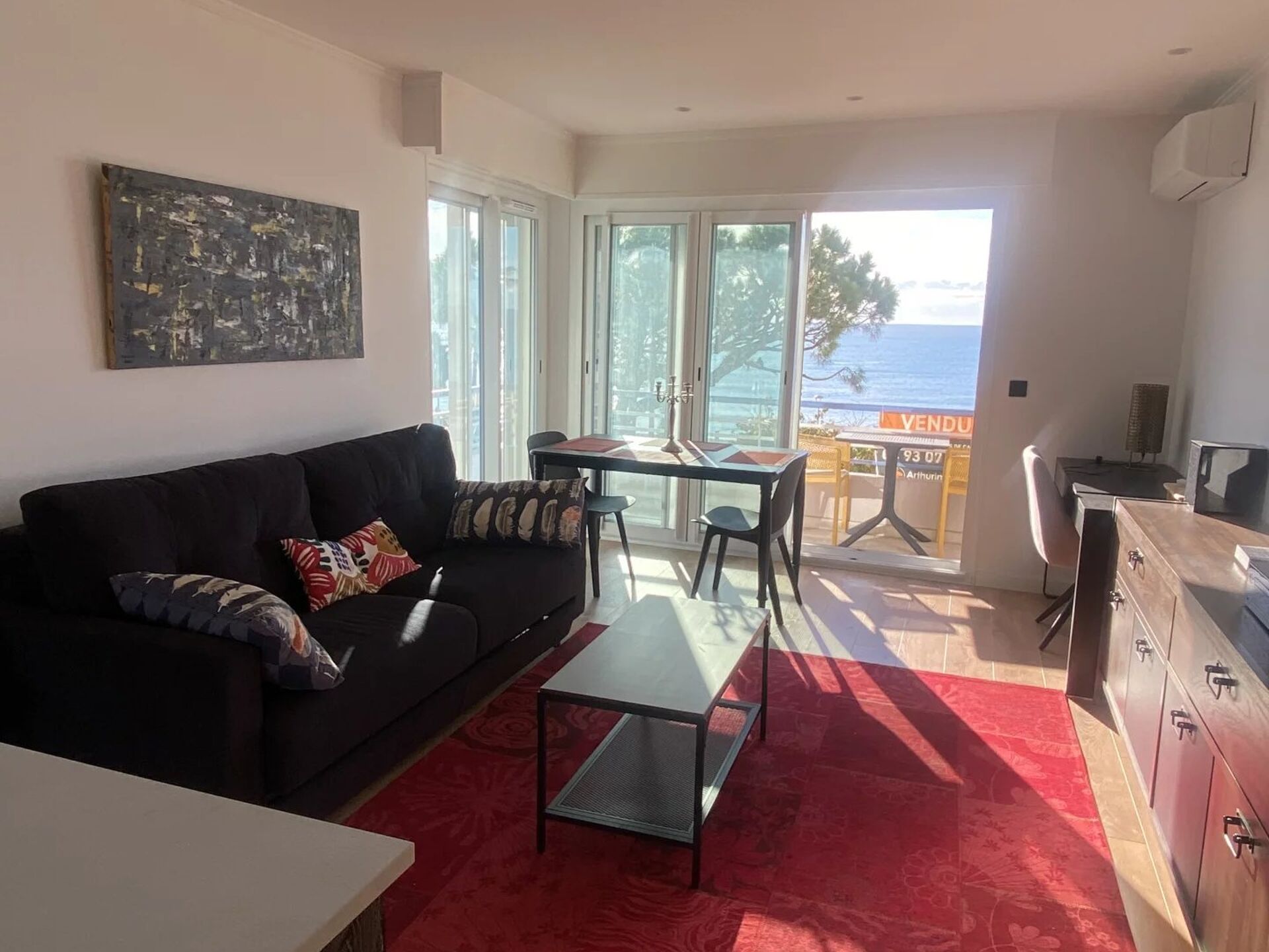 Séjour climatisé profitant d'un accès direct à la terrasse plein sud avec une belle vue mer et ville .