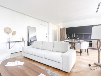 Vaste séjour avec cuisine ouverte équipée, 2 chambres avec leur salle de bains.