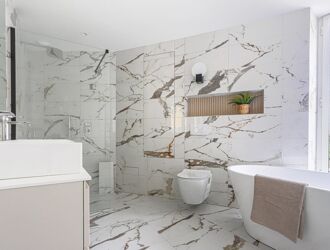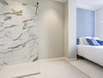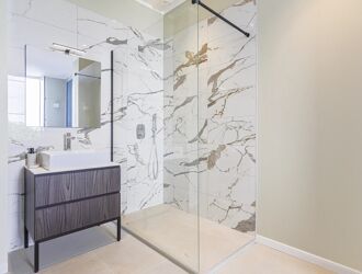 Vaste séjour de 42m² profitant de sa cuisine ouverte équipée, 2 chambres en suite avec salle de bain.